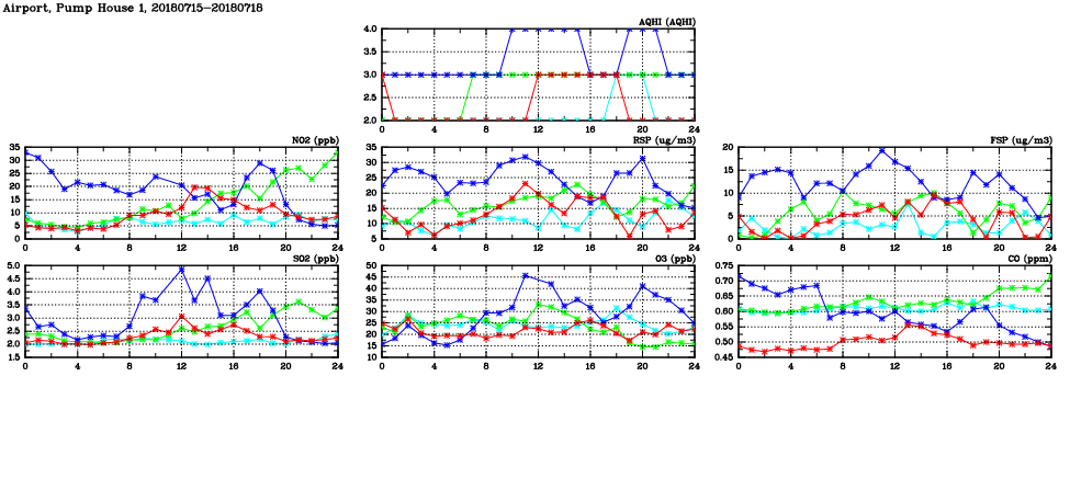 | Air Quality Data Time Series in Airport, Pump House 1 (2018/07/18) | ( Line colors: Day -3 Day -2 Day -1 Current day ) | 2D Map Current AQHI |