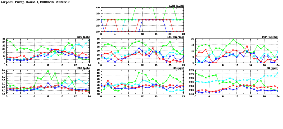 | Air Quality Data Time Series in Airport, Pump House 1 (2018/07/19) | ( Line colors: Day -3 Day -2 Day -1 Current day ) | 2D Map Current AQHI |