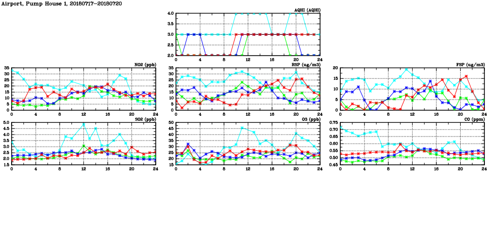 | Air Quality Data Time Series in Airport, Pump House 1 (2018/07/20) | ( Line colors: Day -3 Day -2 Day -1 Current day ) | 2D Map Current AQHI |