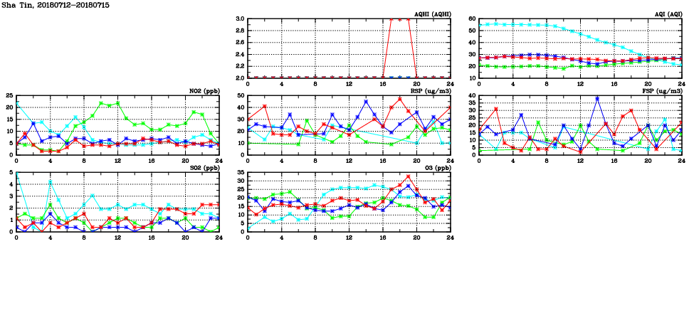 | Air Quality Data Time Series in Sha Tin (2018/07/15) | ( Line colors: Day -3 Day -2 Day -1 Current day ) | 2D Map Current AQHI |