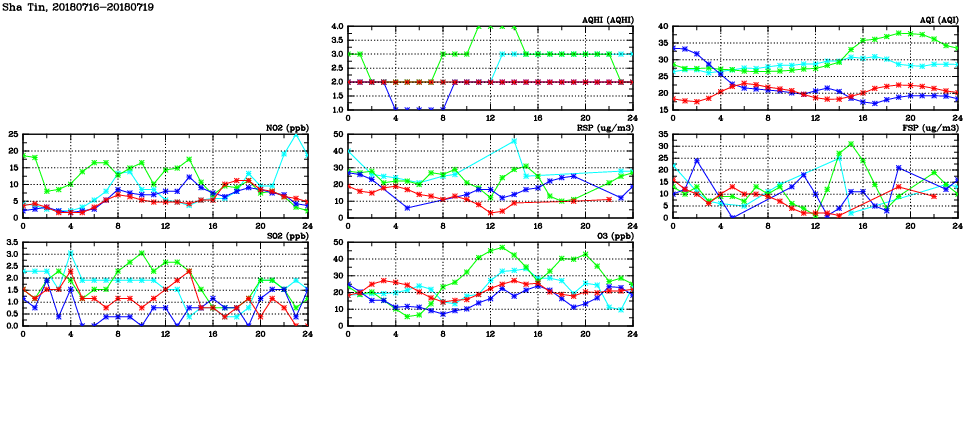 | Air Quality Data Time Series in Sha Tin (2018/07/19) | ( Line colors: Day -3 Day -2 Day -1 Current day ) | 2D Map Current AQHI |