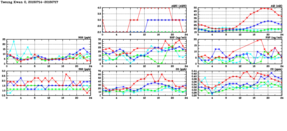 | Air Quality Data Time Series in Tseung Kwan O (2018/07/17) | ( Line colors: Day -3 Day -2 Day -1 Current day ) | 2D Map Current AQHI |