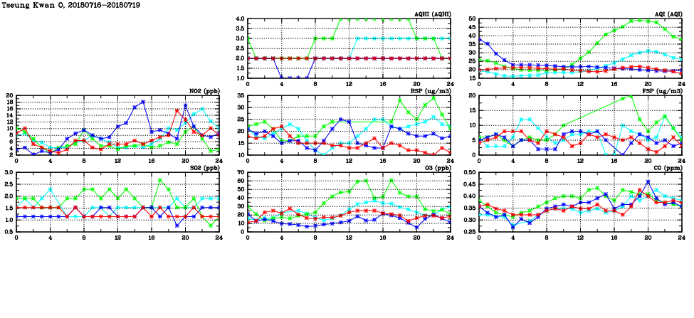 | Air Quality Data Time Series in Tseung Kwan O (2018/07/19) | ( Line colors: Day -3 Day -2 Day -1 Current day ) | 2D Map Current AQHI |