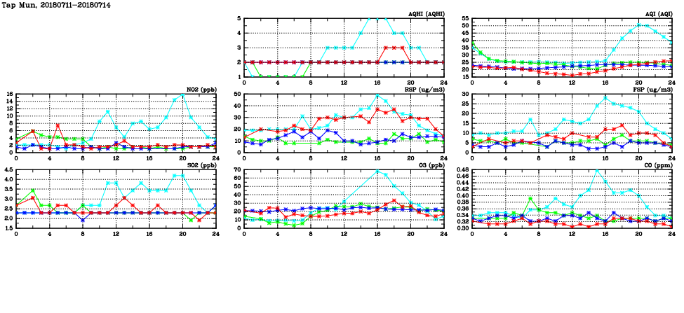 | Air Quality Data Time Series in Tap Mun (2018/07/14) | ( Line colors: Day -3 Day -2 Day -1 Current day ) | 2D Map Current AQHI |