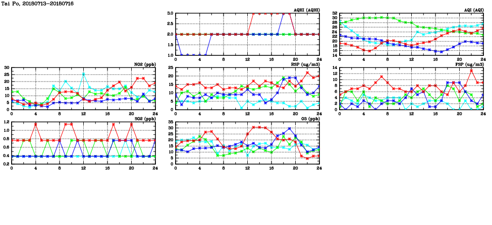 | Air Quality Data Time Series in Tai Po (2018/07/16) | ( Line colors: Day -3 Day -2 Day -1 Current day ) | 2D Map Current AQHI |