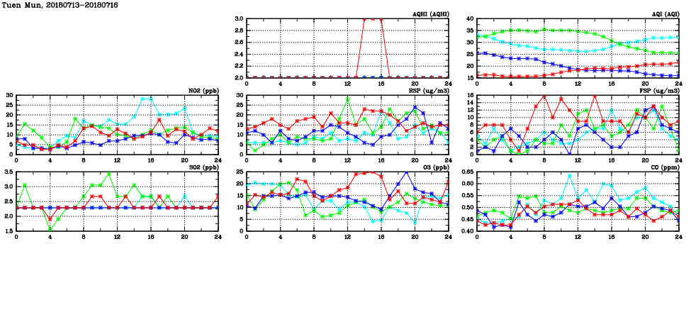 | Air Quality Data Time Series in Tuen Mun (2018/07/16) | ( Line colors: Day -3 Day -2 Day -1 Current day ) | 2D Map Current AQHI |