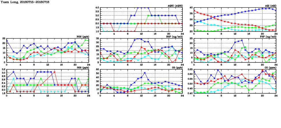 | Air Quality Data Time Series in Yuen Long (2018/07/18) | ( Line colors: Day -3 Day -2 Day -1 Current day ) | 2D Map Current AQHI |