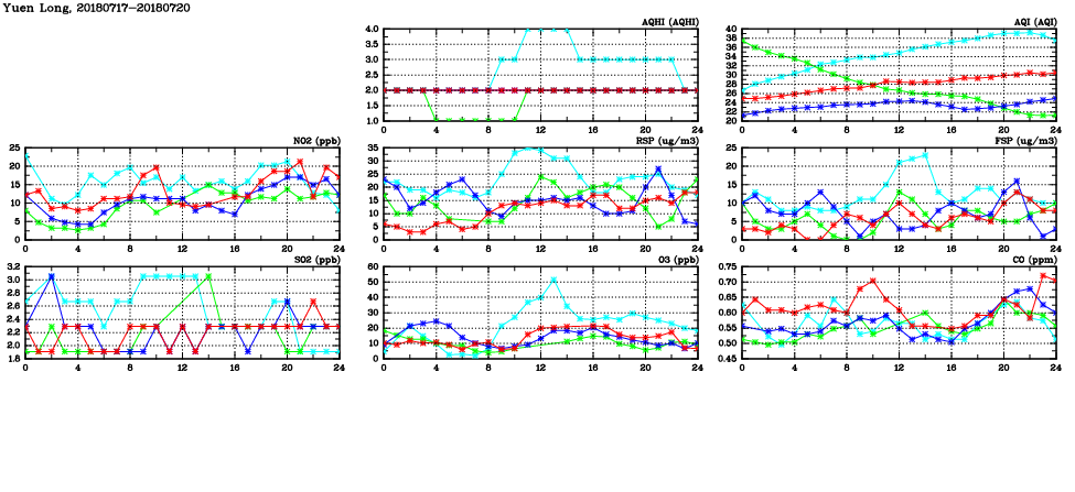 | Air Quality Data Time Series in Yuen Long (2018/07/20) | ( Line colors: Day -3 Day -2 Day -1 Current day ) | 2D Map Current AQHI |