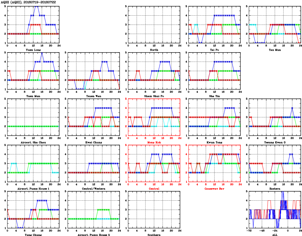 | Air Quality Data Time Series for AQHI (2018/07/22) | ( Line colors: Day -3 Day -2 Day -1 Current day ) | 2D Map Current AQHI |