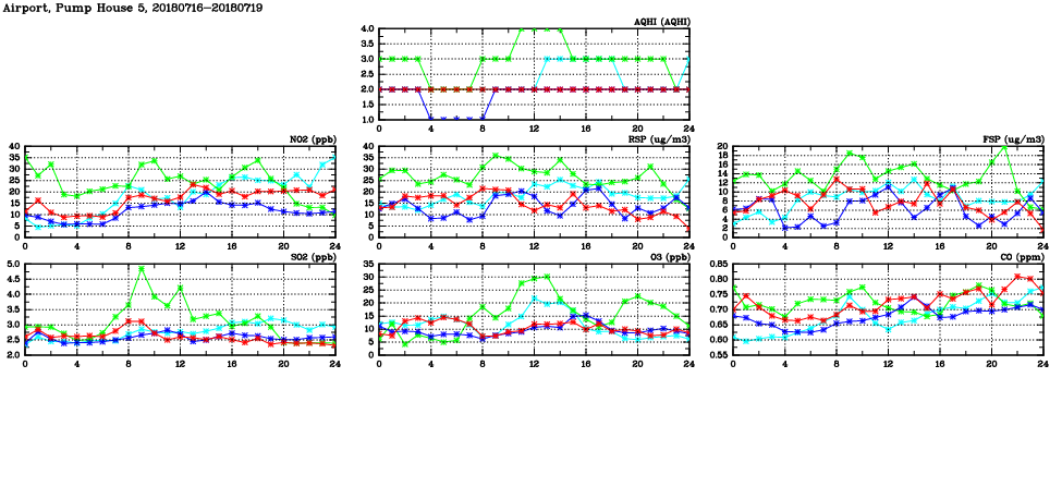 | Air Quality Data Time Series in Airport, Pump House 5 (2018/07/19) | ( Line colors: Day -3 Day -2 Day -1 Current day ) | 2D Map Current AQHI |