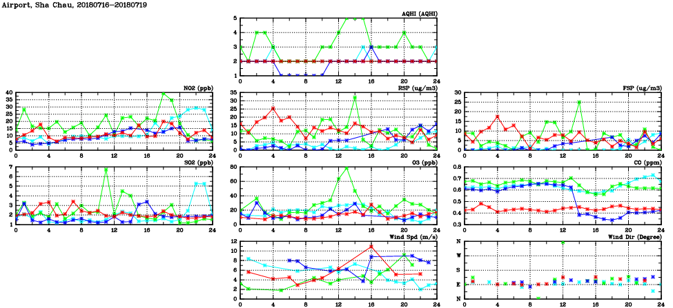 | Air Quality Data Time Series in Airport, Sha Chau (2018/07/19) | ( Line colors: Day -3 Day -2 Day -1 Current day ) | 2D Map Current AQHI |