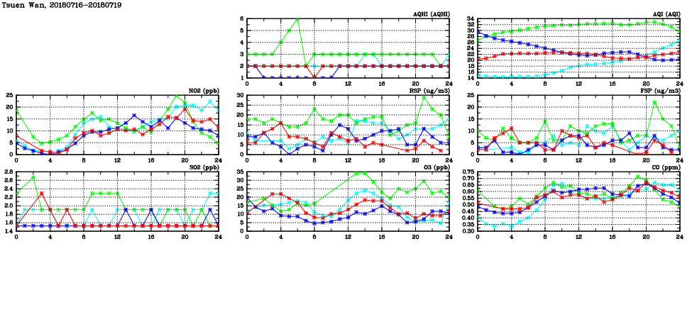 | Air Quality Data Time Series in Tsuen Wan (2018/07/19) | ( Line colors: Day -3 Day -2 Day -1 Current day ) | 2D Map Current AQHI |