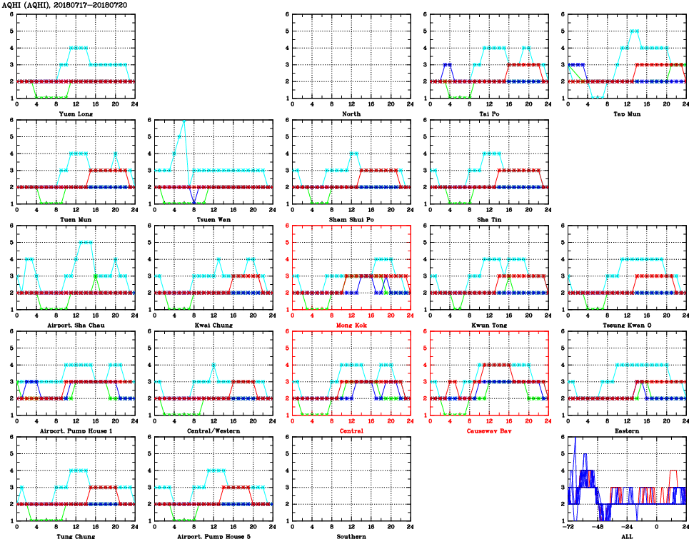 | Air Quality Data Time Series for AQHI (2018/07/20) | ( Line colors: Day -3 Day -2 Day -1 Current day ) | 2D Map Current AQHI |