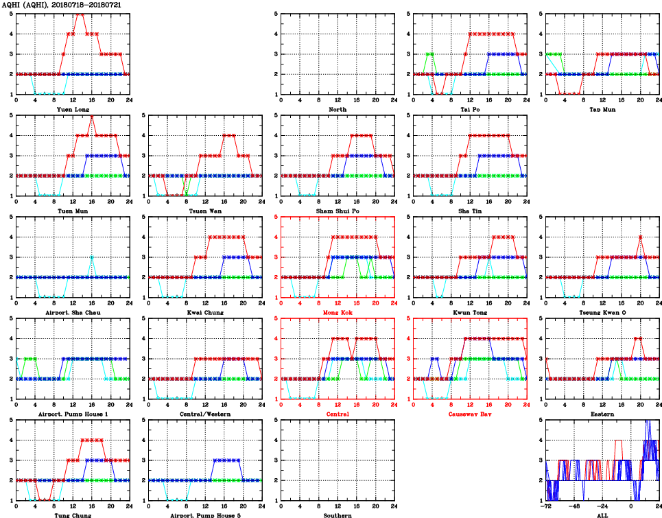 | Air Quality Data Time Series for AQHI (2018/07/21) | ( Line colors: Day -3 Day -2 Day -1 Current day ) | 2D Map Current AQHI |
