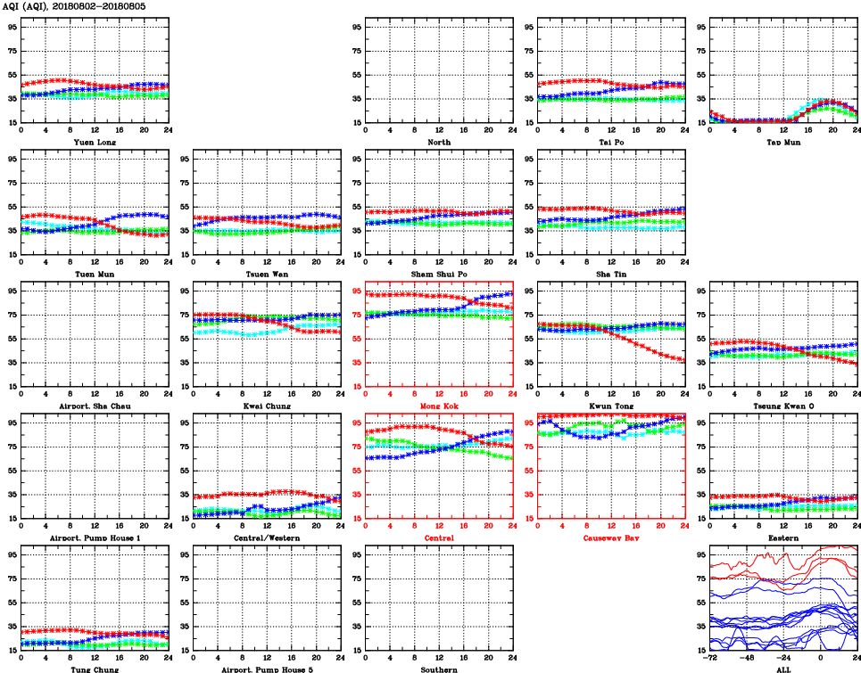 | Air Quality Data Time Series for AQI (2018/08/05) | ( Line colors: Day -3 Day -2 Day -1 Current day ) | 2D Map Current AQHI |