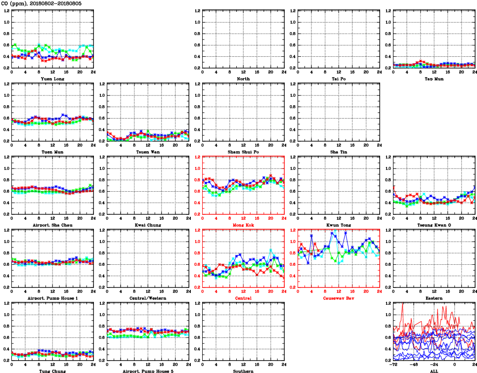 | Air Quality Data Time Series for CO (2018/08/05) | ( Line colors: Day -3 Day -2 Day -1 Current day ) | 2D Map Current AQHI |