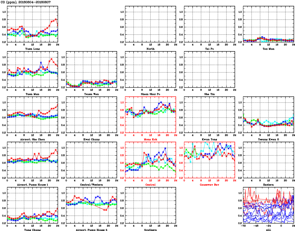 | Air Quality Data Time Series for CO (2018/08/07) | ( Line colors: Day -3 Day -2 Day -1 Current day ) | 2D Map Current AQHI |
