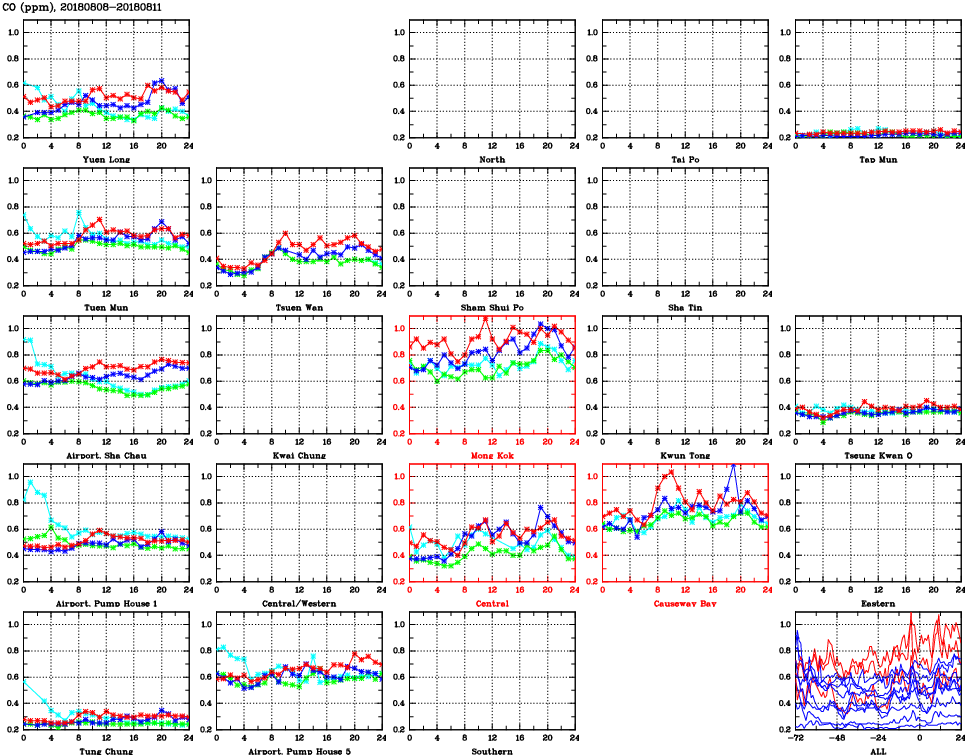 | Air Quality Data Time Series for CO (2018/08/11) | ( Line colors: Day -3 Day -2 Day -1 Current day ) | 2D Map Current AQHI |