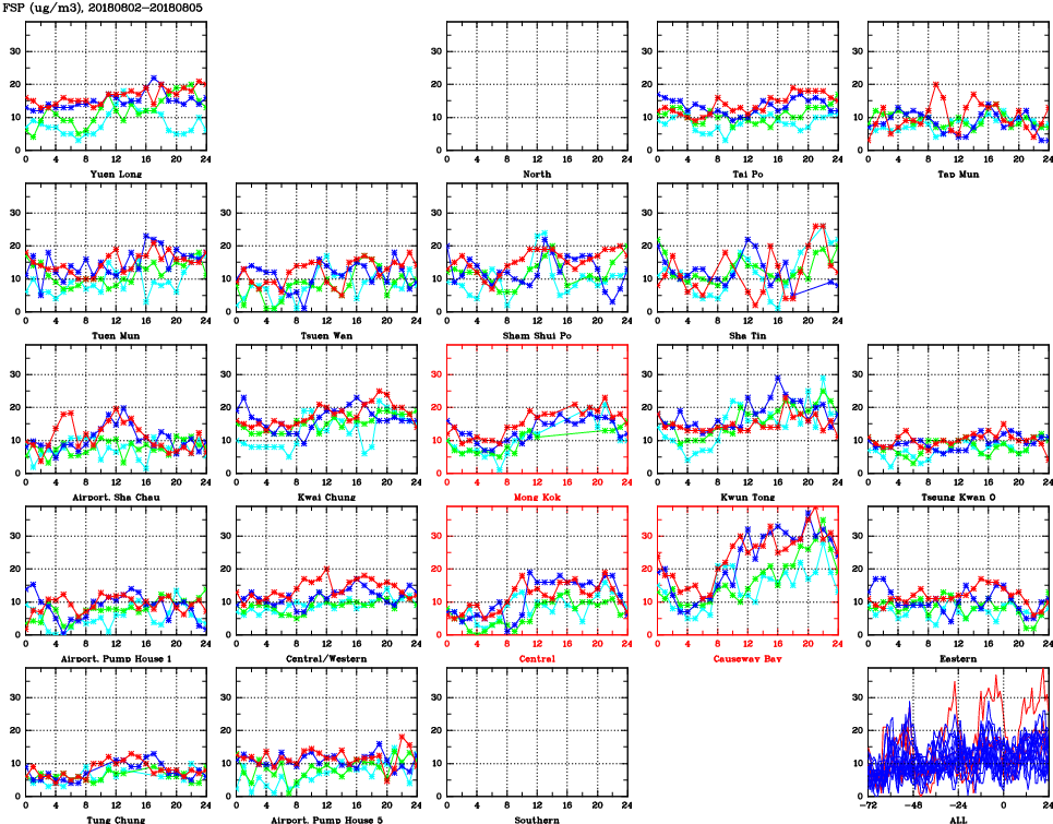 | Air Quality Data Time Series for FSP (2018/08/05) | ( Line colors: Day -3 Day -2 Day -1 Current day ) | 2D Map Current AQHI |