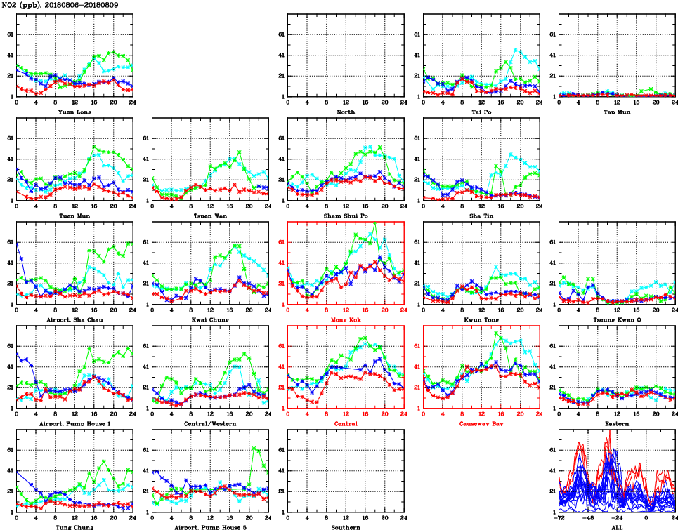 | Air Quality Data Time Series for NO2 (2018/08/09) | ( Line colors: Day -3 Day -2 Day -1 Current day ) | 2D Map Current AQHI |
