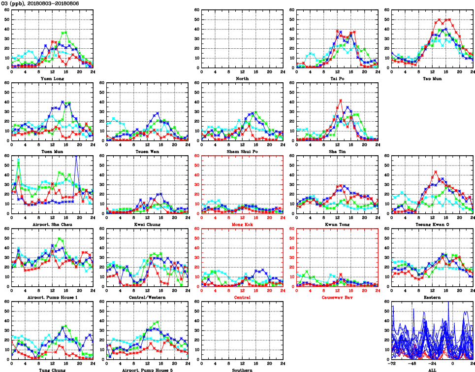 | Air Quality Data Time Series for O3 (2018/08/06) | ( Line colors: Day -3 Day -2 Day -1 Current day ) | 2D Map Current AQHI |