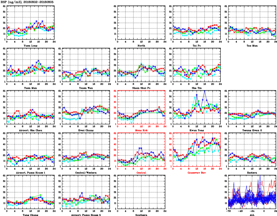 | Air Quality Data Time Series for RSP (2018/08/05) | ( Line colors: Day -3 Day -2 Day -1 Current day ) | 2D Map Current AQHI |