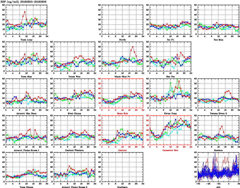 | Air Quality Data Time Series for RSP (2018/08/06) | ( Line colors: Day -3 Day -2 Day -1 Current day ) | 2D Map Current AQHI |
