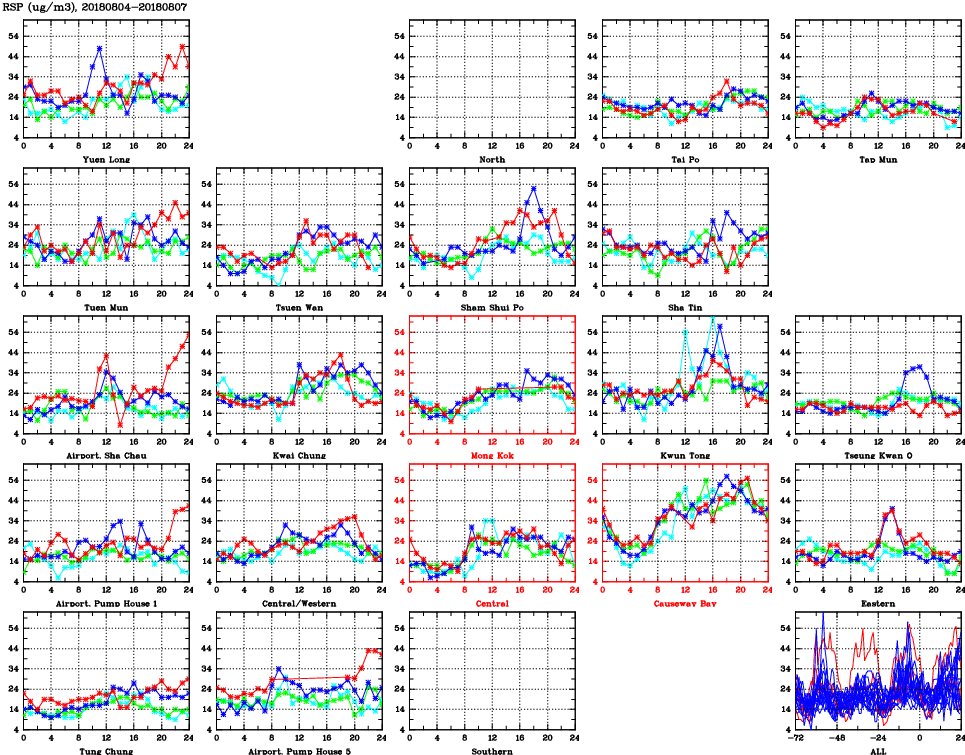| Air Quality Data Time Series for RSP (2018/08/07) | ( Line colors: Day -3 Day -2 Day -1 Current day ) | 2D Map Current AQHI |