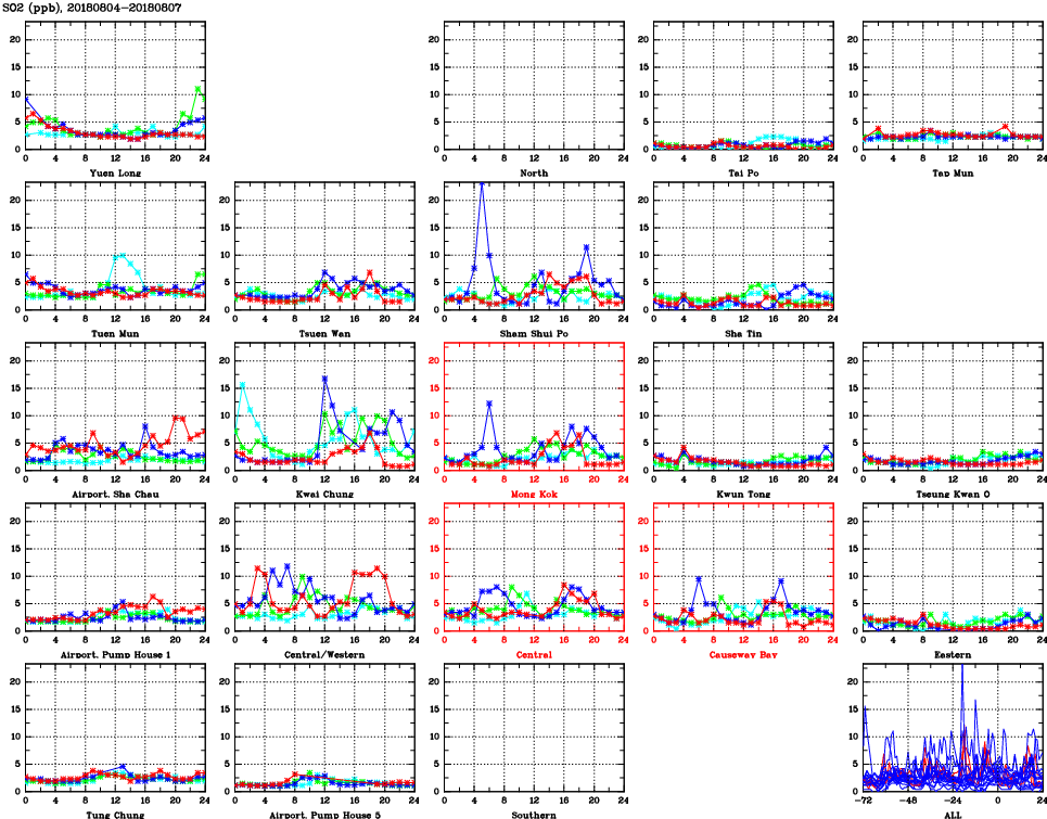 | Air Quality Data Time Series for SO2 (2018/08/07) | ( Line colors: Day -3 Day -2 Day -1 Current day ) | 2D Map Current AQHI |
