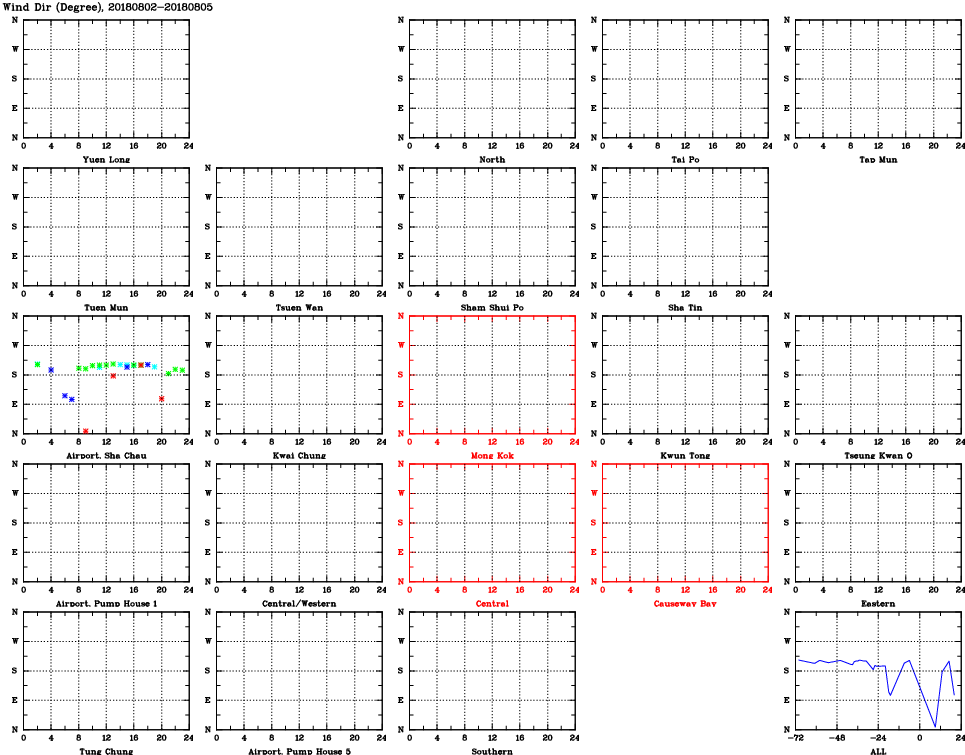 | Air Quality Data Time Series for WD (2018/08/05) | ( Line colors: Day -3 Day -2 Day -1 Current day ) | 2D Map Current AQHI |