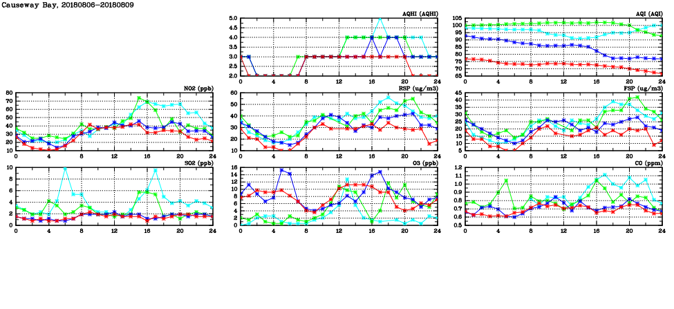 | Air Quality Data Time Series in Causeway Bay (2018/08/09) | ( Line colors: Day -3 Day -2 Day -1 Current day ) | 2D Map Current AQHI |