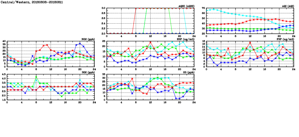 | Air Quality Data Time Series in Central/Western (2018/08/11) | ( Line colors: Day -3 Day -2 Day -1 Current day ) | 2D Map Current AQHI |