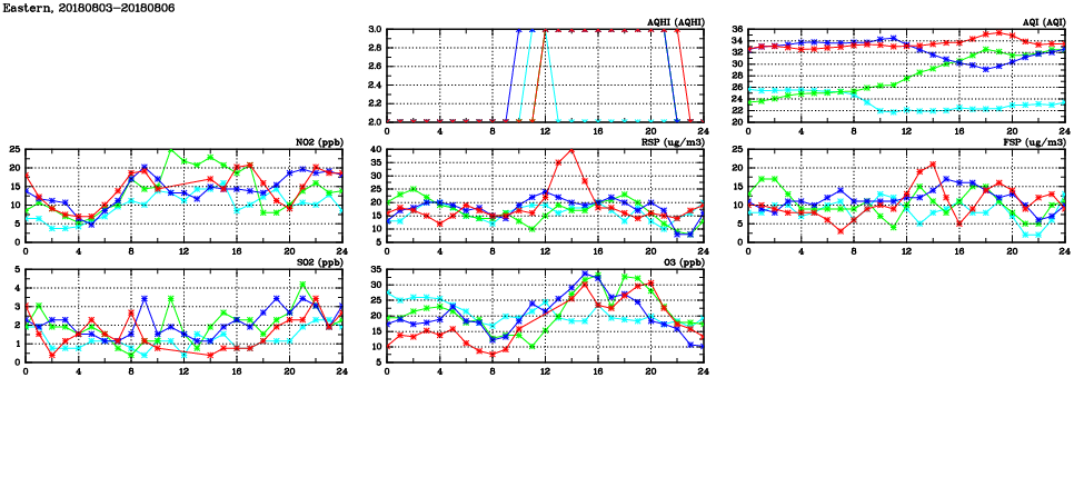 | Air Quality Data Time Series in Eastern (2018/08/06) | ( Line colors: Day -3 Day -2 Day -1 Current day ) | 2D Map Current AQHI |