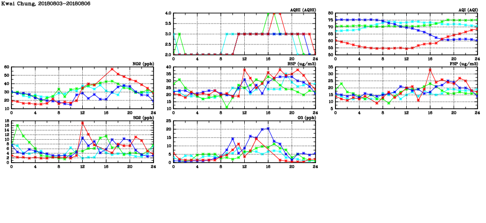 | Air Quality Data Time Series in Kwai Chung (2018/08/06) | ( Line colors: Day -3 Day -2 Day -1 Current day ) | 2D Map Current AQHI |