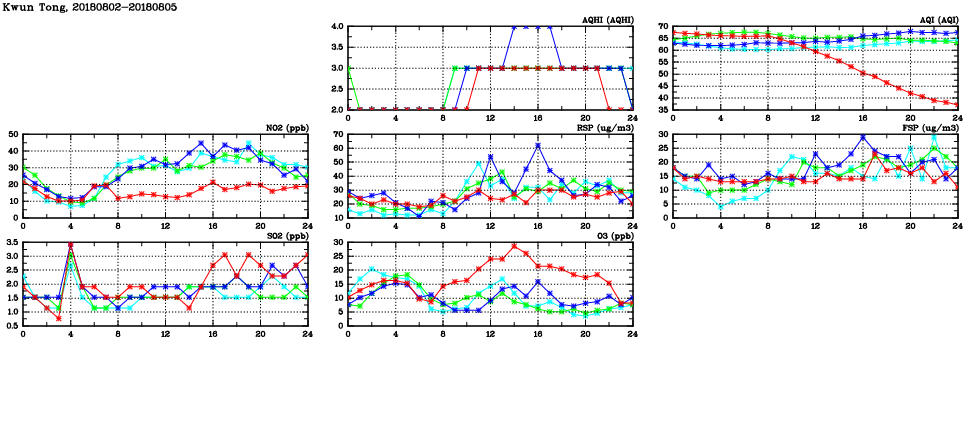 | Air Quality Data Time Series in Kwun Tong (2018/08/05) | ( Line colors: Day -3 Day -2 Day -1 Current day ) | 2D Map Current AQHI |