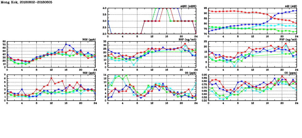 | Air Quality Data Time Series in Mong Kok (2018/08/05) | ( Line colors: Day -3 Day -2 Day -1 Current day ) | 2D Map Current AQHI |