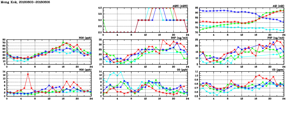 | Air Quality Data Time Series in Mong Kok (2018/08/06) | ( Line colors: Day -3 Day -2 Day -1 Current day ) | 2D Map Current AQHI |