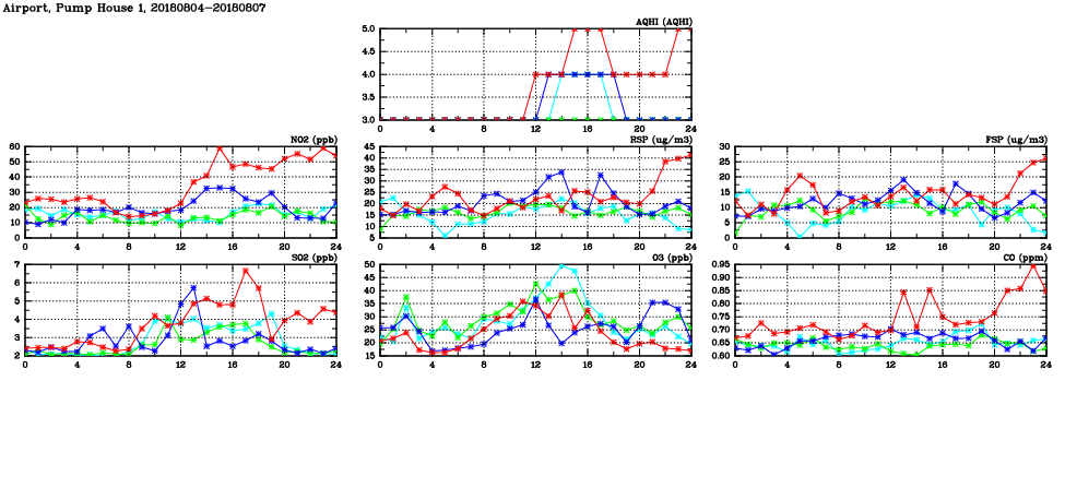 | Air Quality Data Time Series in Airport, Pump House 1 (2018/08/07) | ( Line colors: Day -3 Day -2 Day -1 Current day ) | 2D Map Current AQHI |