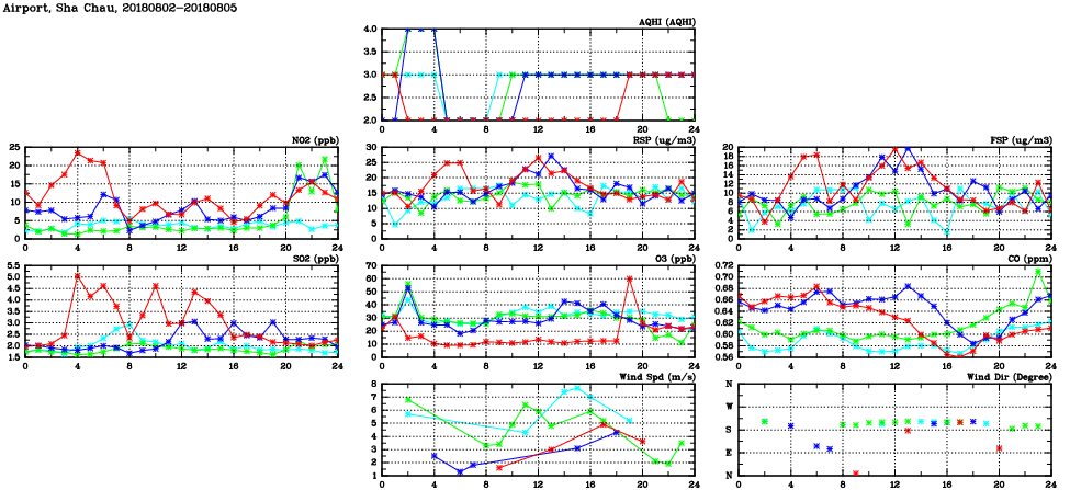 | Air Quality Data Time Series in Airport, Sha Chau (2018/08/05) | ( Line colors: Day -3 Day -2 Day -1 Current day ) | 2D Map Current AQHI |
