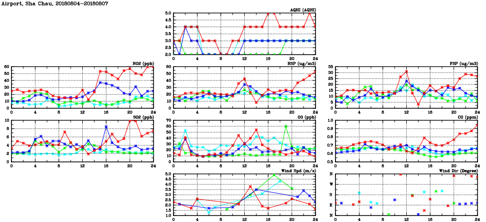 | Air Quality Data Time Series in Airport, Sha Chau (2018/08/07) | ( Line colors: Day -3 Day -2 Day -1 Current day ) | 2D Map Current AQHI |