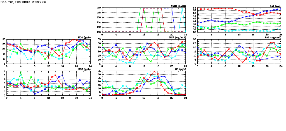 | Air Quality Data Time Series in Sha Tin (2018/08/05) | ( Line colors: Day -3 Day -2 Day -1 Current day ) | 2D Map Current AQHI |