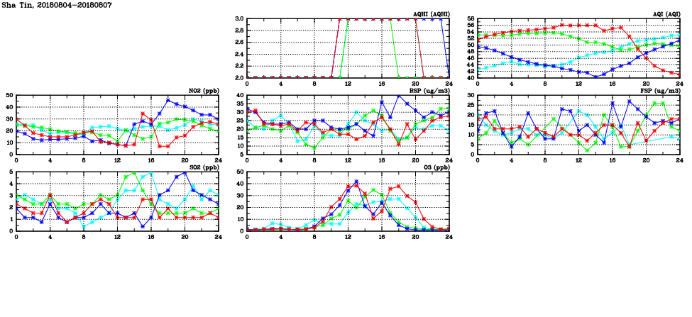 | Air Quality Data Time Series in Sha Tin (2018/08/07) | ( Line colors: Day -3 Day -2 Day -1 Current day ) | 2D Map Current AQHI |