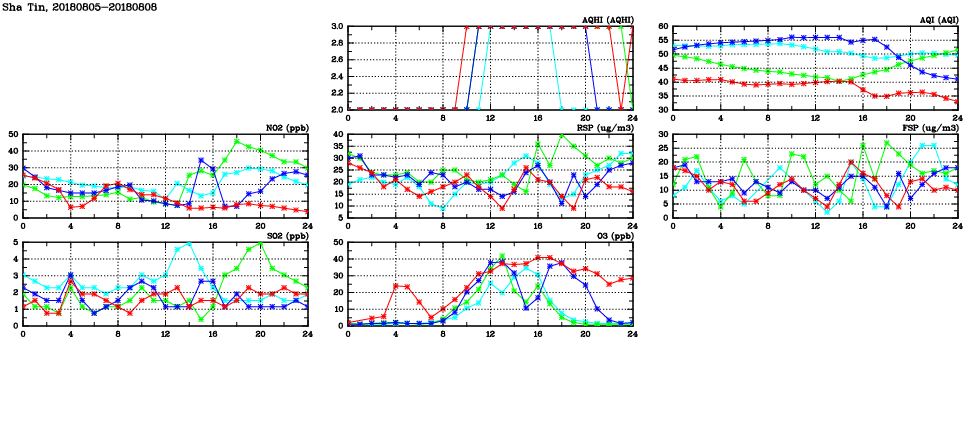| Air Quality Data Time Series in Sha Tin (2018/08/08) | ( Line colors: Day -3 Day -2 Day -1 Current day ) | 2D Map Current AQHI |