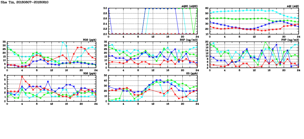 | Air Quality Data Time Series in Sha Tin (2018/08/10) | ( Line colors: Day -3 Day -2 Day -1 Current day ) | 2D Map Current AQHI |