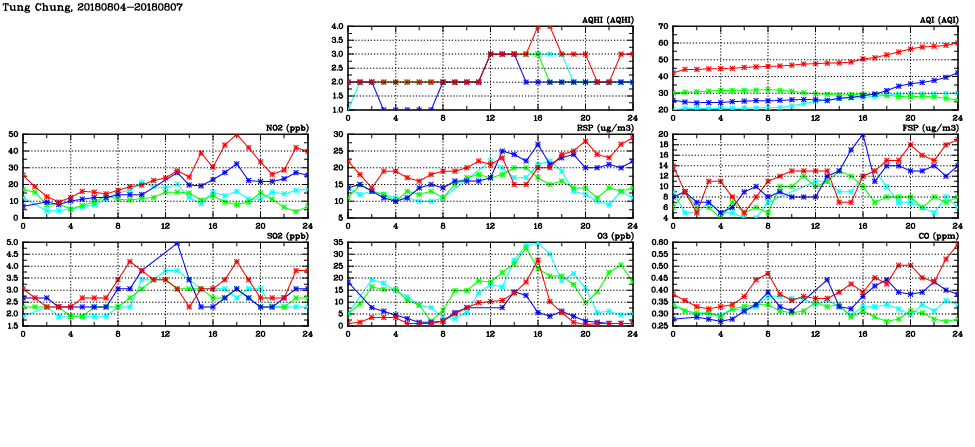 | Air Quality Data Time Series in Tung Chung (2018/08/07) | ( Line colors: Day -3 Day -2 Day -1 Current day ) | 2D Map Current AQHI |