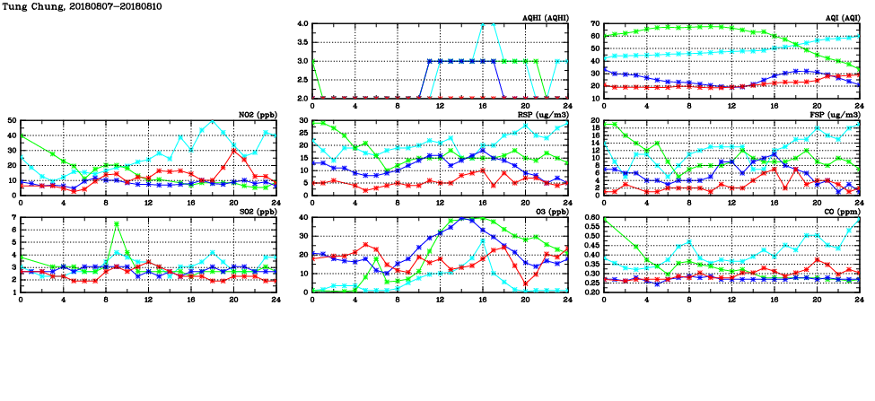 | Air Quality Data Time Series in Tung Chung (2018/08/10) | ( Line colors: Day -3 Day -2 Day -1 Current day ) | 2D Map Current AQHI |