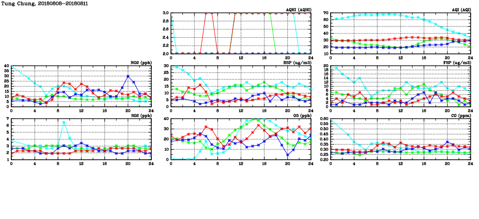 | Air Quality Data Time Series in Tung Chung (2018/08/11) | ( Line colors: Day -3 Day -2 Day -1 Current day ) | 2D Map Current AQHI |