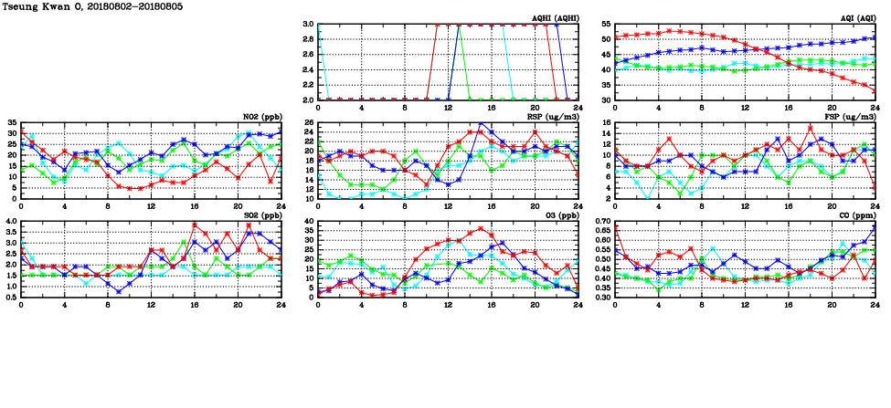 | Air Quality Data Time Series in Tseung Kwan O (2018/08/05) | ( Line colors: Day -3 Day -2 Day -1 Current day ) | 2D Map Current AQHI |
