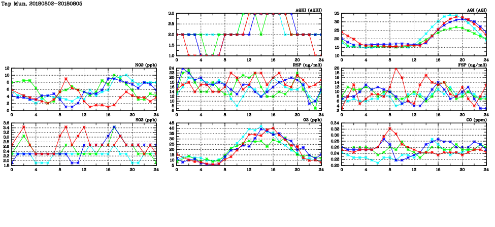 | Air Quality Data Time Series in Tap Mun (2018/08/05) | ( Line colors: Day -3 Day -2 Day -1 Current day ) | 2D Map Current AQHI |