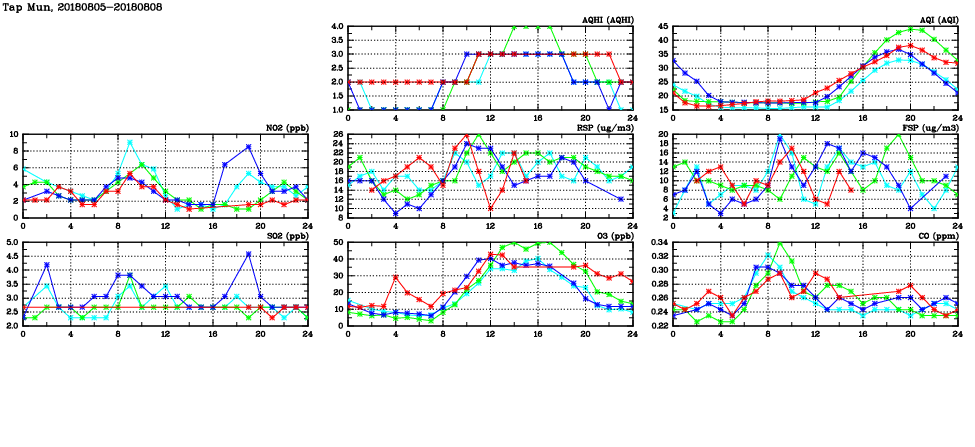 | Air Quality Data Time Series in Tap Mun (2018/08/08) | ( Line colors: Day -3 Day -2 Day -1 Current day ) | 2D Map Current AQHI |